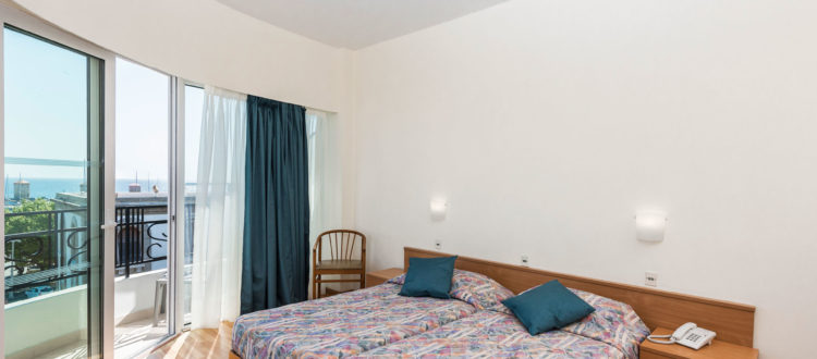 Private room with private balcony. It has typical Greek décor. There is air conditioning, a TV and a mini fridge.